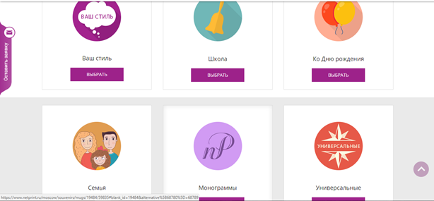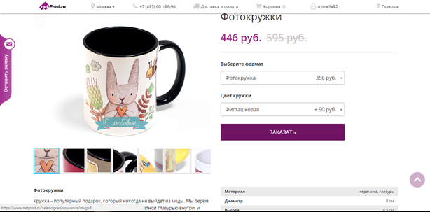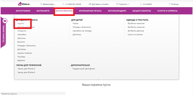 После этого можно добавлять в корзину понравившиеся товары и услуги. Например, чтобы заказать фотокружку, щелкните на вкладку фотосувениры и выберите категорию «Кружки».